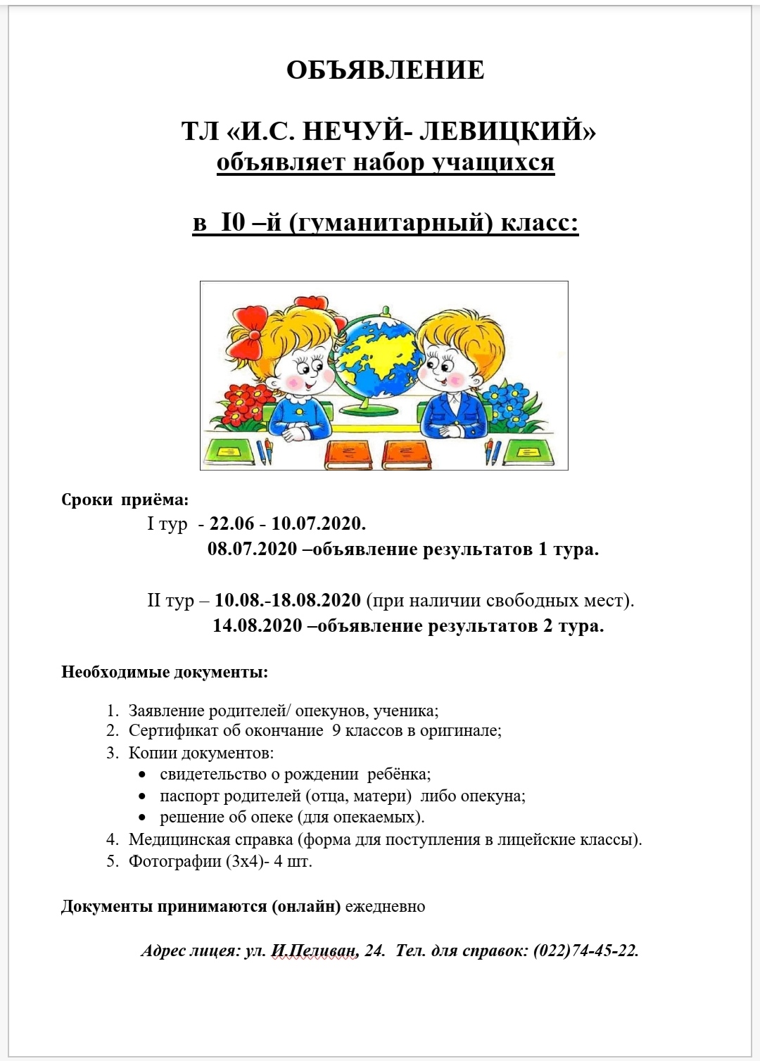Admitere în clasa X. LT I.S. Neciui-Levițchi