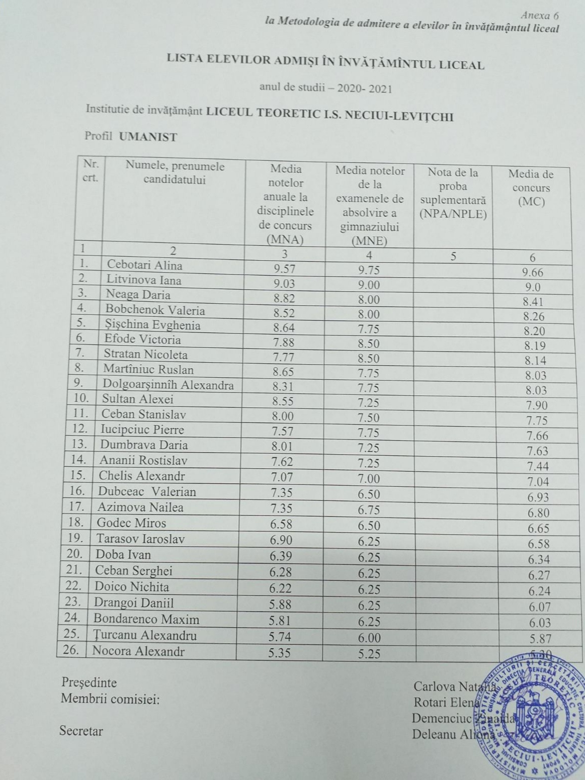 Lista elevilor admişi în învăţămîntul liceal 2020-2021